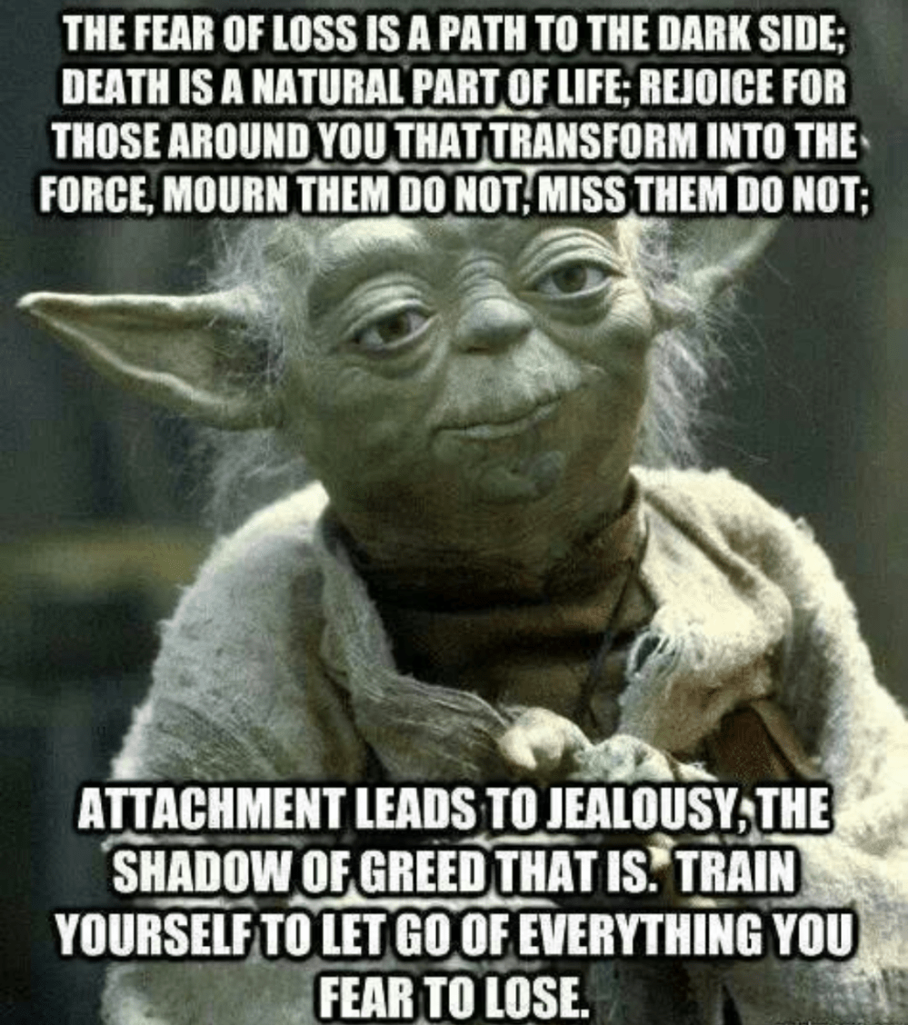 It has taken me most of this lifetime to completely embrace this wisdom (and who knows how many prior lifetimes) but who’s counting right? What’s most important is that we learn these Important lessons, no matter how many experiences it takes us. A beautiful and truthful quote by none other than my good buddy/guru Yoda states:”The fear of loss is a path to the dark side; Death is a natural part of life. Rejoice for those around you who transform into the Force, Mourn them do not, Miss them do not; Attachment leads to jealousy, the shadow of greed that is. Train Yourself to let go of everything you fear to lose.” ~Yoda