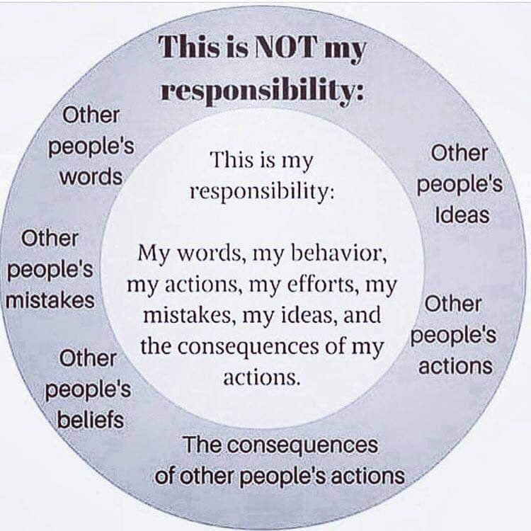 I help my Soul Coaching clients with charts like this often. This one is so beautifully clear. It’s so important to truly grasp one’s level of true responsibility as so many are allowing themselves to be drained by carrying others’ responsibilities upon themselves. This is such a common misalignment of our wounded egoic perspective, the perspective of “Over Responsibility”.